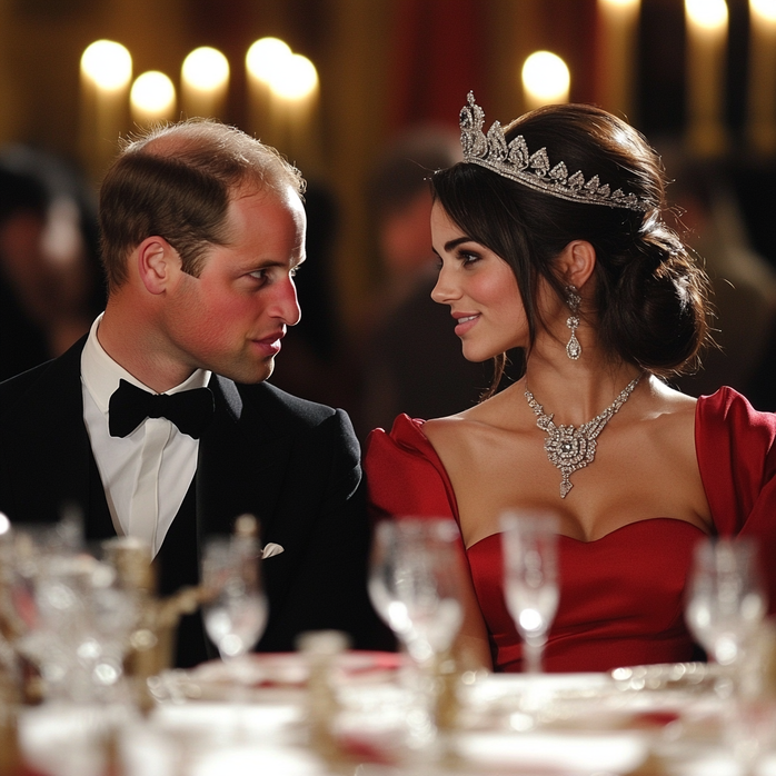 Po wymianie uprzejmości goście wraz z gospodarzami przeszli do hallu, z którego skierowali się w stronę Sali Bankietowej. Wszyscy tam już czekali na pojawienie się najważniejszym osobistości. Gdy drzwi się otworzyły natychmiast rozległ się dźwięk fanfar na wejście. Odegrane zostały hymny, podano do stołów i nastąpił czas przemów. Pierwsza zaczęła Królowa.