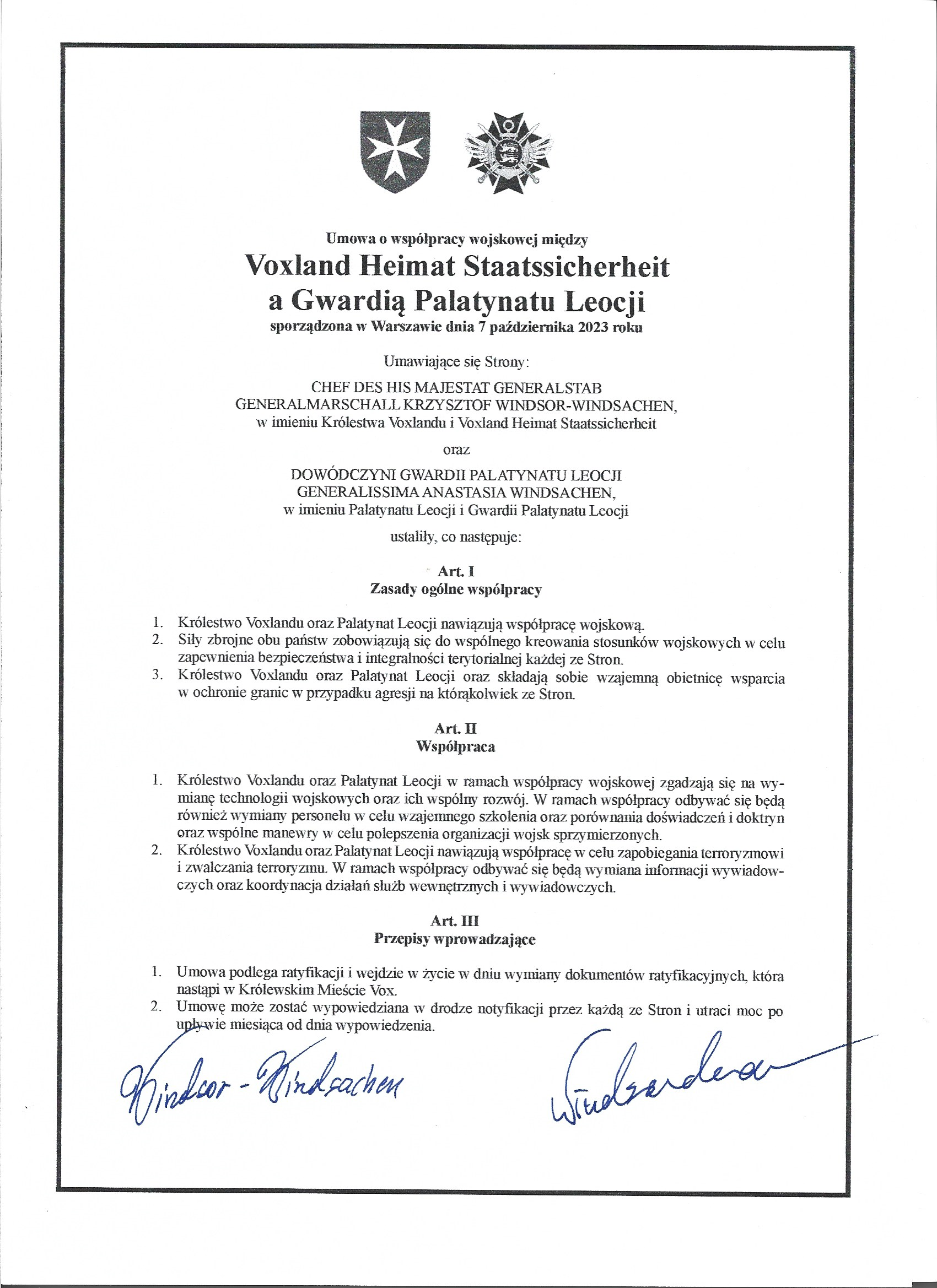 Umowa o współpracy wojskowej między Voxland Heimat Staatssicherheit a Gwardią Palatynatu Leocji