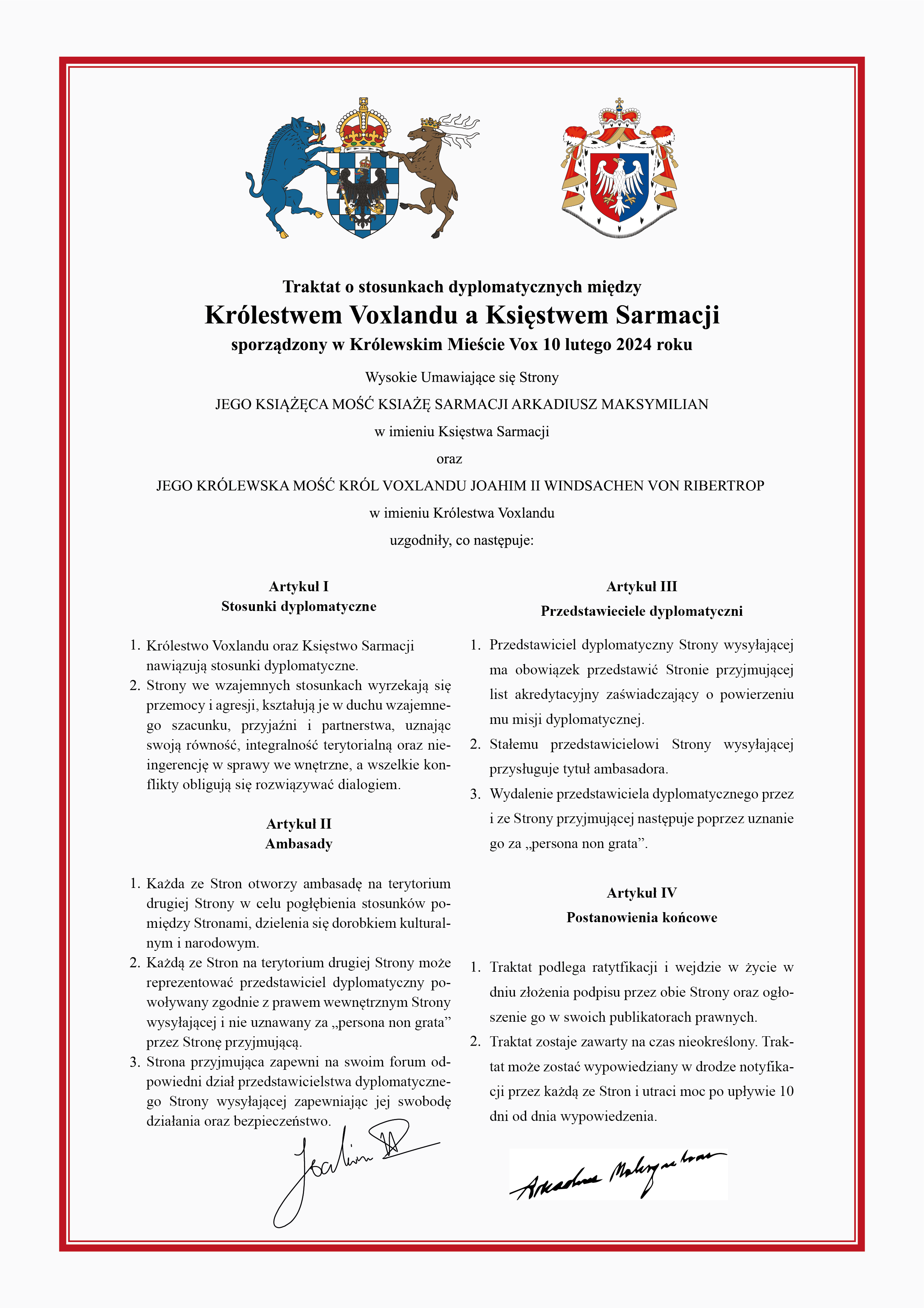 W roku, który nie tak dawno rozpoczęliśmy Sarmacja przeżywać będzie dwudziestą drugą rocznicę swojego istnienia. To w porównaniu z Królestwem Voxlandu — ogrom czasu. Historia Waszego kraju, można rzec, rozpoczęła się przed kilkoma laty. Od tamtej pory kroczy mikronacyjną drogą przez kolejne formalne byty czy narodościowe związki. Początkowo zjednoczone z państwem Westlandu i innymi, przez przekształcenie się w Cesarstwo Insuli, od którego rozpocząłem swą pierwszą podróż na Nordacie, kończąc na Królestwie Voxlandu powstałym we wrześniu ubiegłego roku. To krótka, aczkolwiek dynamiczna historia zmian, a przede wszystkim — ludzi, którzy ów zmiany początkowali. Nie sposób pominąć tutaj wkładu rodziny Windsachenów wywodzących się z Sarmacji, w to jakim miejscem jest teraz Wasz kraj. Jak wspomniałem — ród Windsachenów to ród sarmacki. Z wieloma z Was miałem okazję współpracować oraz działać na rzecz spraw Sarmacji. Królowa Anastasia była niegdyś marszałkiem mojego dworu, a Książę Koronny, jako arcybiskup, przewodził nie jednej liturgii w mojej intencji. Nie ma co ukrywać — to właśnie Wasz wkład i Wasze dziedzictwo sprawiło, że jestem dzisiaj tutaj i składam tę wizytę. Czynię to również po to, aby urzeczywistnić pewien symbol. Symbol zapoczątkowania oficjalnych relacji pomiędzy Sarmacją a Voxlandem, co dzisiaj czynimy. Chcemy wnieść je na, jak najlepszy możliwy w danym czasie, poziom. Nasi obywatele na to zasługują, aby mieć nowych przyjaciół. Moja wizyta tutaj to również symbol otwarcia nowych relacji pomiędzy nami — między mną, a przedstawicielami voxlandzkiej rodziny królewskiej. Po oschłych stosunkach i — niekiedy — złośliwych komentarzach wypowiadanych w przestrzeni publicznej, czas na odrzucenie złej energii i wprowadzenie harmonii oraz wzajemnego wsparcia. Wszakże to od nas samych — a w szczególności od rządzących — leżą podstawy do przyszłości naszych państw i całego mikroświata w ogóle. Zasady fair play i wartości powszechnie cenione — to są te elementy, na których Sarmacja chce budować swą przyszłość i zapraszamy do tego wszystkie kraje Pollinu. Cieszę się, że Voxland to zaproszenie przyjmuje.