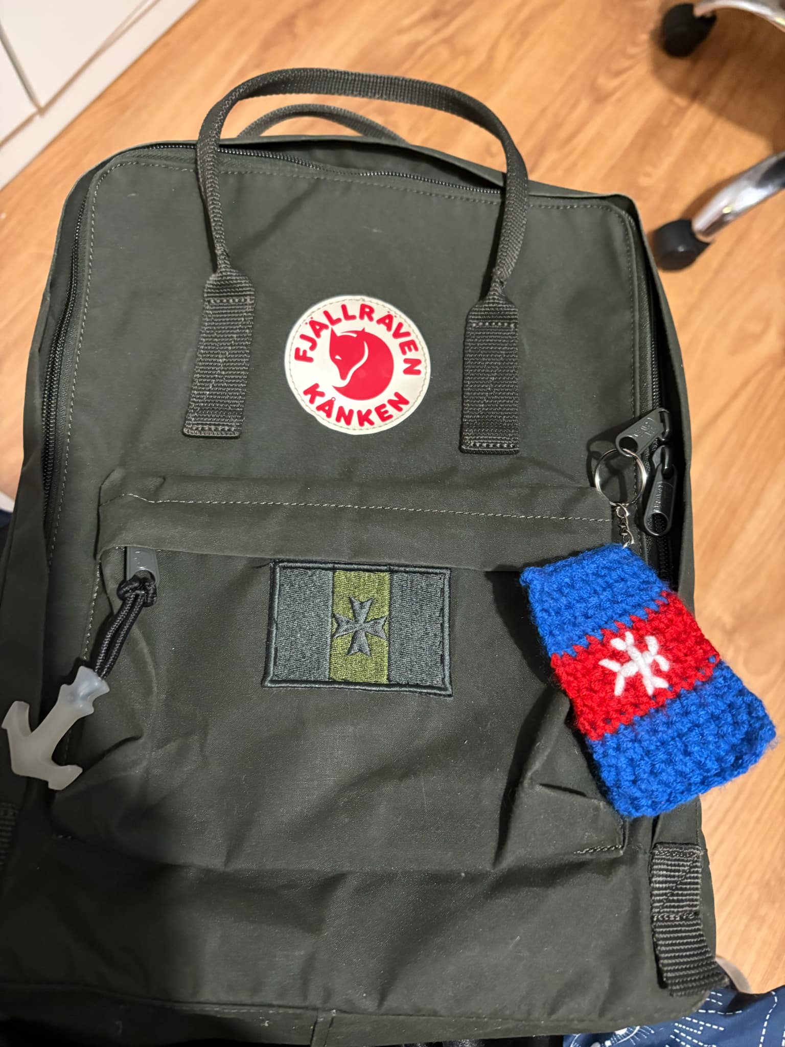 Naszywka flagi w wersji o obniżonej widoczności oraz wyżej wymieniona zawieszka na plecaku