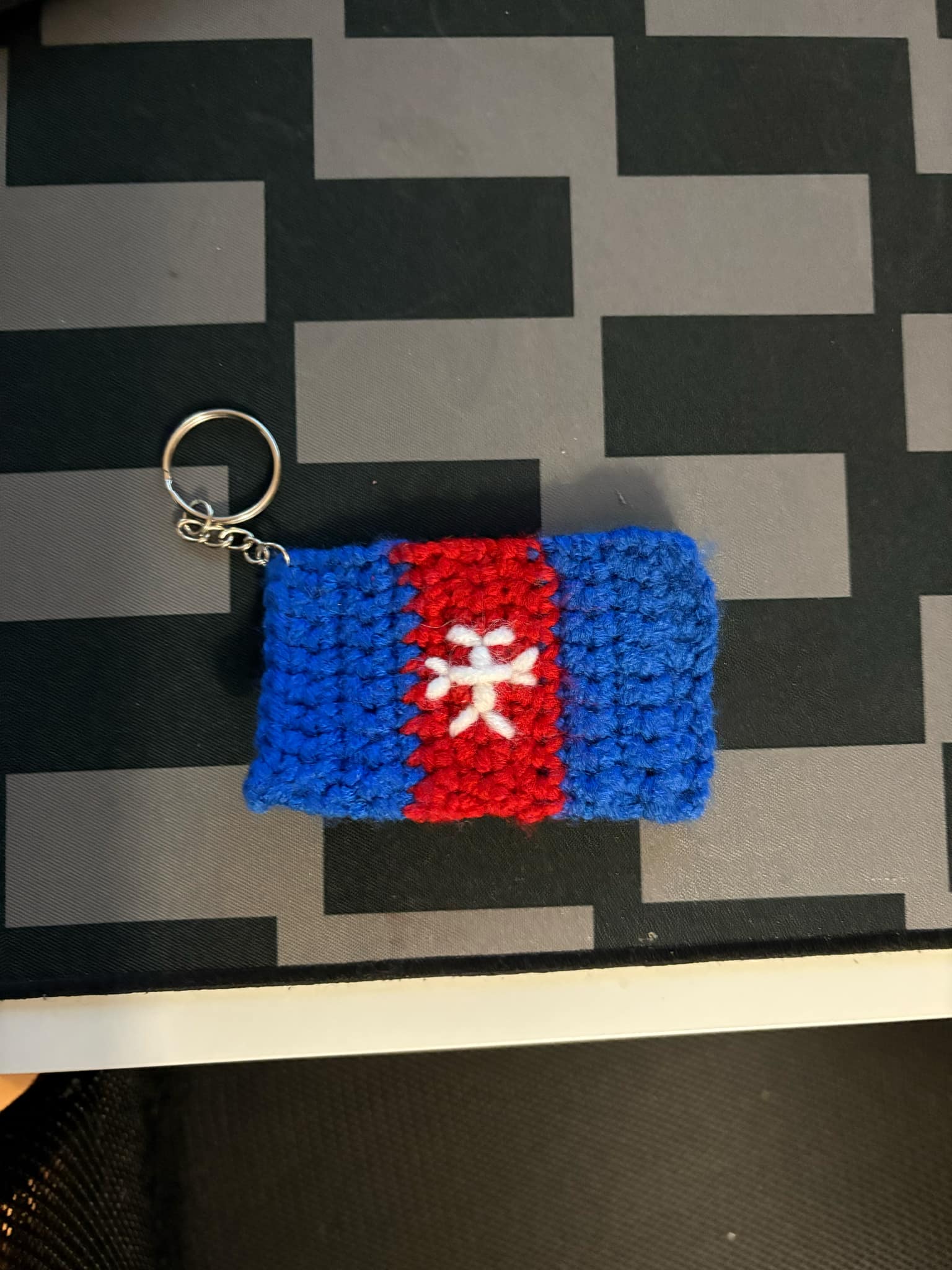 Flaga Voxlandu wykonana ręcznie na szydełku z certyfikatem Voxlandske Qualitat w formie zawieszki
