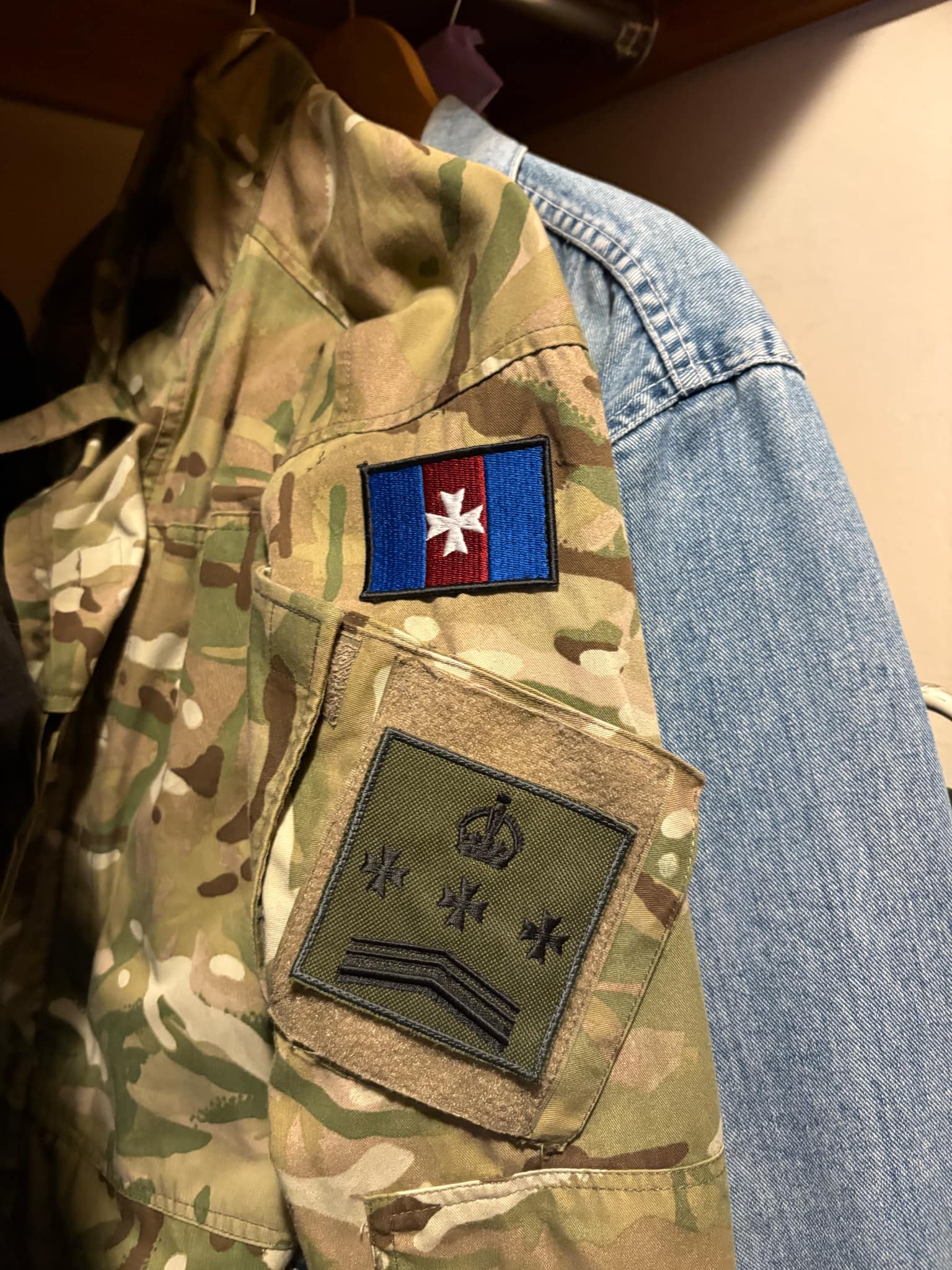 Naszywka flagi oraz stopień wojskowy na rzep prezentujące się na mundurze polowym