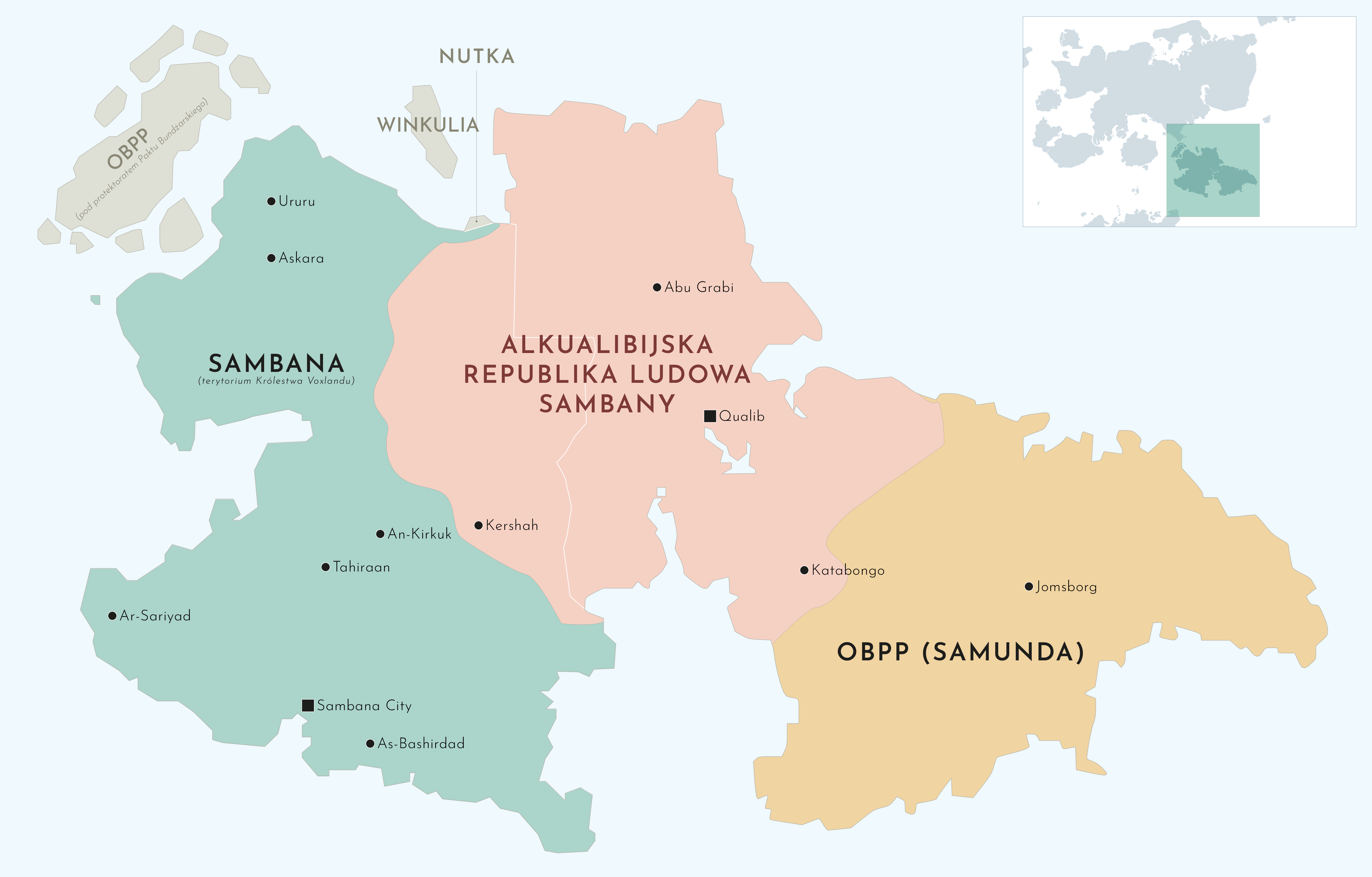 W tym samym czasie, gdy zaprowadzano nowy ład na terenach pod jurysdykcją voxlandzkiej Korony, na obszarach dawnej Samundy rósł w siłę nowy byt, który od dłuższego czasu pozostawał pod czujnym okiem wywiadu, jednak nie był uznawany za niebezpieczny. Rozbicie sił Dżamahiriji Al-Rajnu sprawiło, że powstała pustka, która dawała przestrzeń do rozwoju innych państw lub organizacji. W okolicach jeziora Omar mieści się miasto Qualib będące kolebką al-qualib - religii wywodzącej się z tamtego regionu. Powstała ona w 648 r. n.e., gdy swoje tezy zaczął głosić Abi Muammar al-Zawahiri, który twierdził, że doznał boskiego objawienia. Przez ponad 1000 lat swojego istnienia wierzenie to miało ogromny wpływ zarówno na rozwój i dzisiejszy klimat kulturowy Sambanafryki, ale również i okolicznych ziem. Upadła już Dżamahirija była jednym z państw, które u swoich podstaw miało zasady al-qualib. Na przełomie 2021 i 2022 w regionie Qualib powstała Alkualibijska Republika Ludowa Sambany (ARLS), która kieruje się nauczaniami zawartymi w Tohwa - świętej księdze al-qualib, a także zmodyfikowaną ideą ponadnarodowego proleteriatu. Ze względu na istniejącą na północy Dżamahiriję, państwo to początkowo zajmowało kolejne ziemie na południu, dochodząc ostatecznie do Katabongo, gdzie zatrzymali je Samundczycy. Po długich bojach stoczonych między oboma grupami został zawarty pokój, który ugruntował południową granicę ARLS.