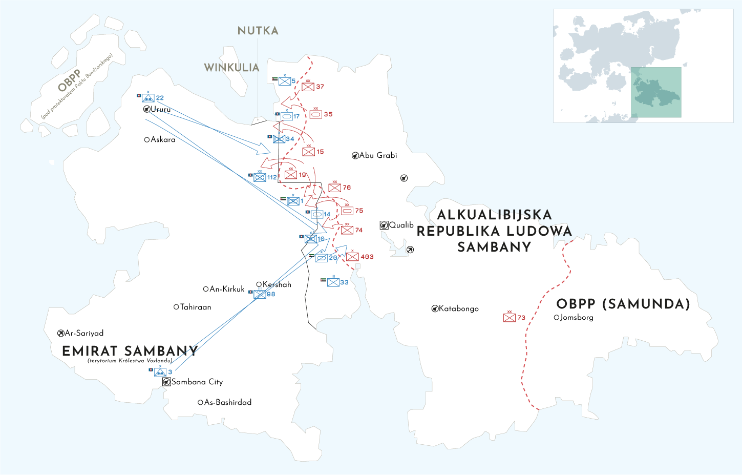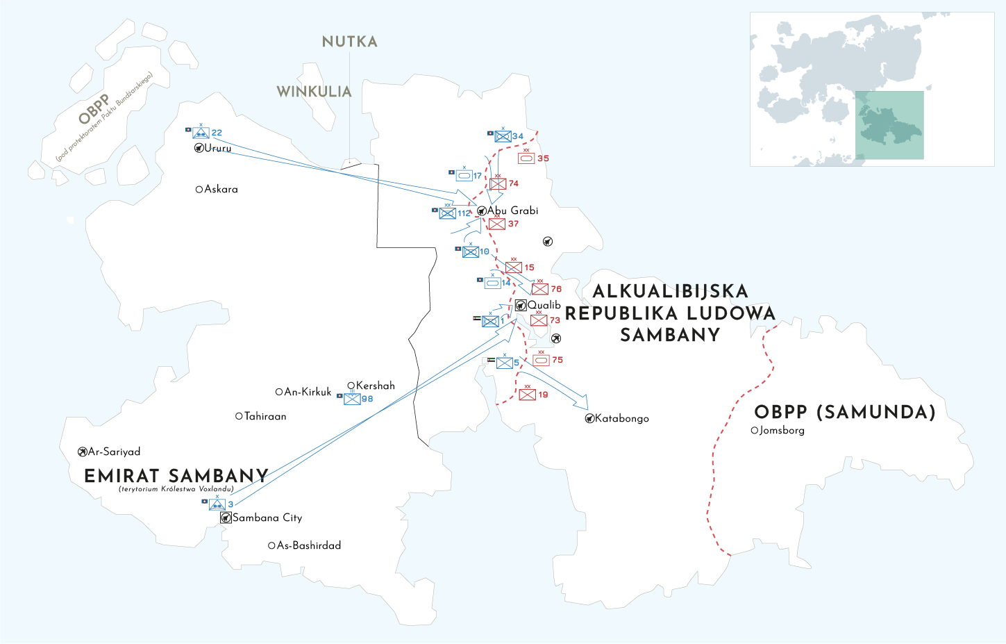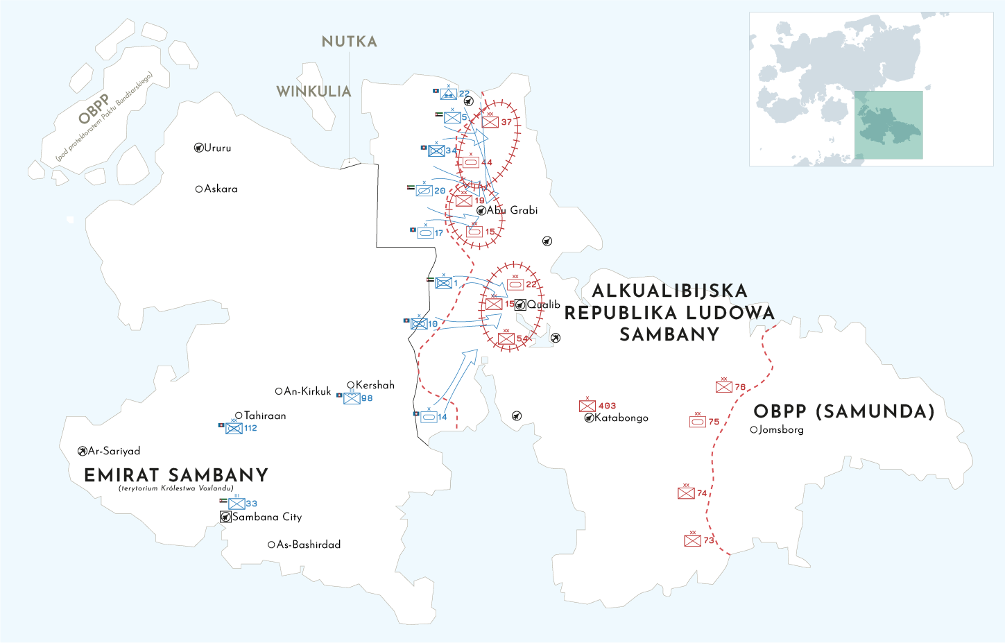 24 lutego o godz. 5:47 czasu sambańskiego Alkualibijska Armia Wyzwolenia przekroczyła granicę z Sambaną rozpoczynając tym samym atak na terytorium zamorskie Królestwa Voxlandu. Niewielki siły stojące na granicy zostały zaatakowane z zaskoczenia i nie zdołały powstrzymać przeciwnika. Pozostałe jednostki Sambańskiego Okręgu Wojskowego z racji na nieprzygotowanie na zbrojną agresję nie były w stanie gotowości pozwalającym na szybką reakcję. Oprócz tego największe zgrupowania znajdowały się z dala od granicy. W ramach wsparcia znajdujących się na niej jednostek z 2. Bazy Lotnictwa Szkolnego wystartowała Eskadra SBL Speerspitc, która musiała jednak przerwać działania i wycofać się wobec przewagi lotnictwa przeciwnika. Myśliwce JQ-29M, które były zmodernizowanymi wersjami zwykłych 29 należących niegdyś do Dżamahiriji były znaczącym się przeciwnikiem dla szkolnych myśliwców.